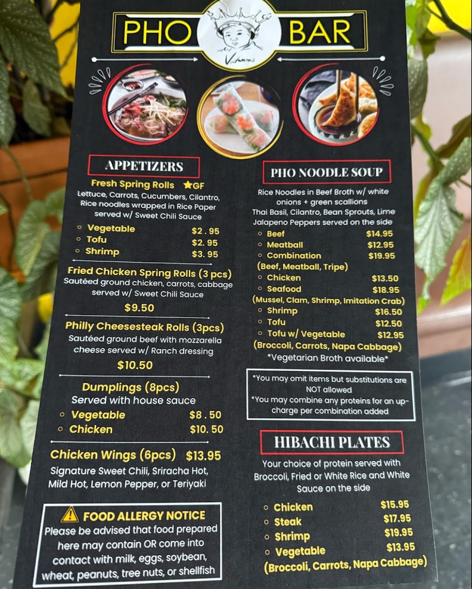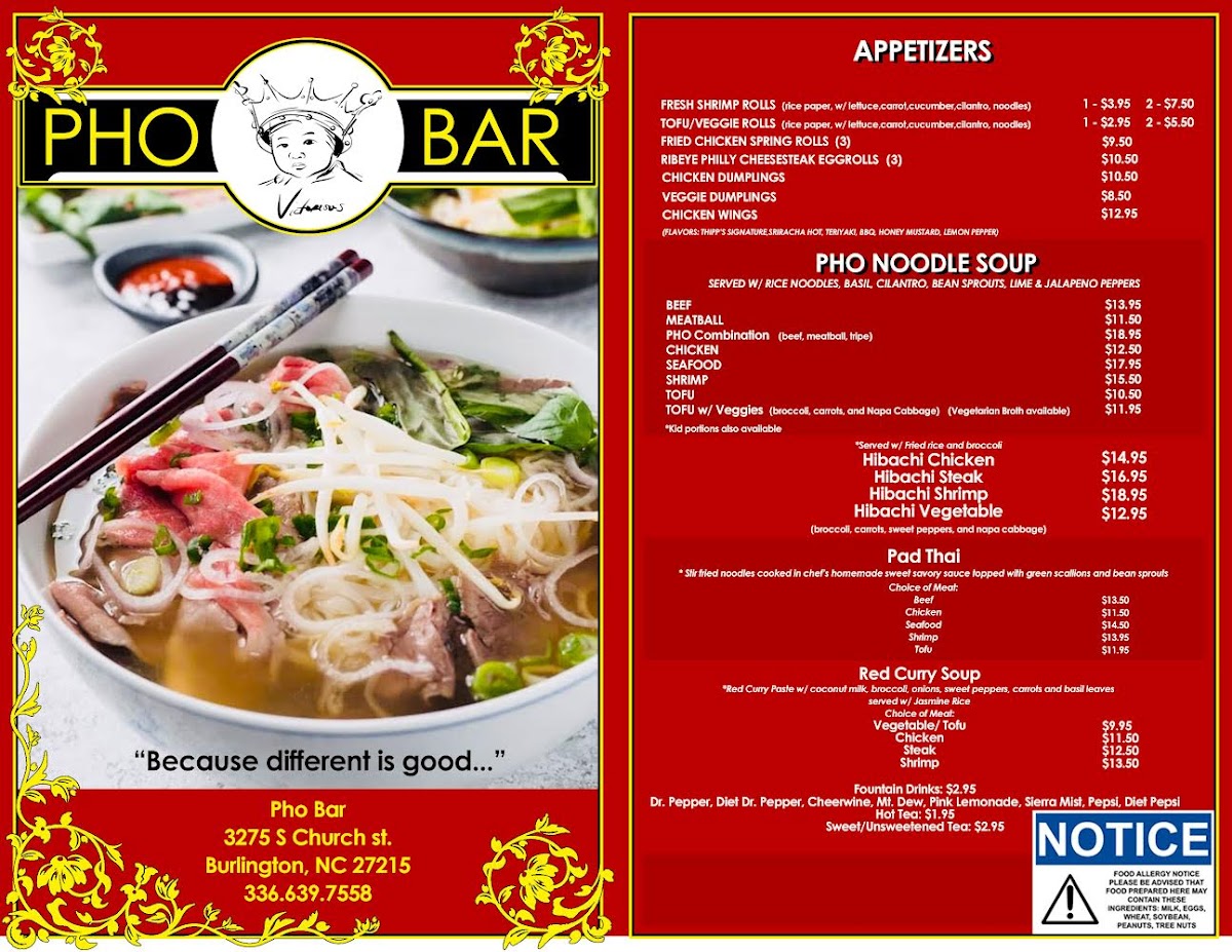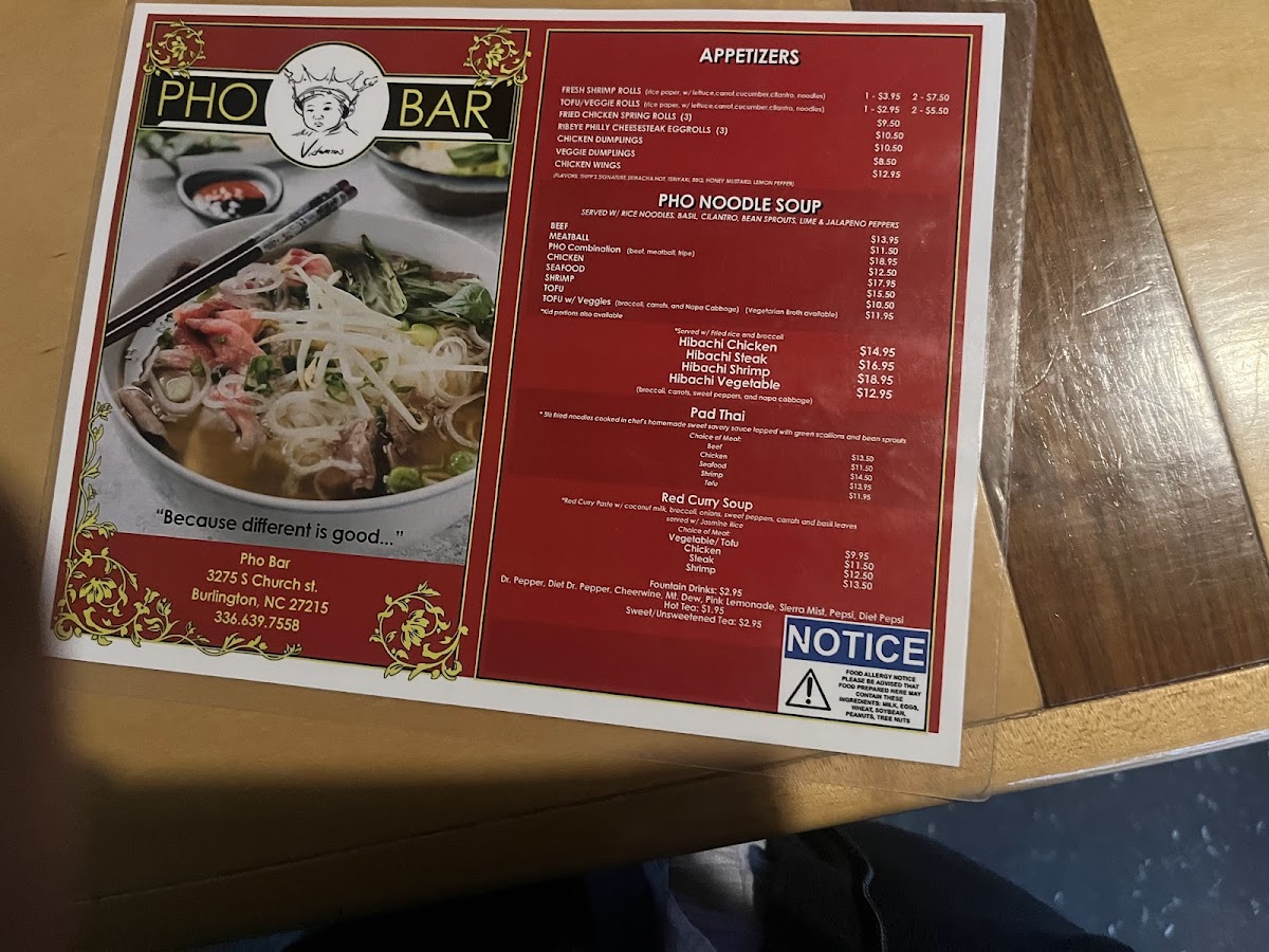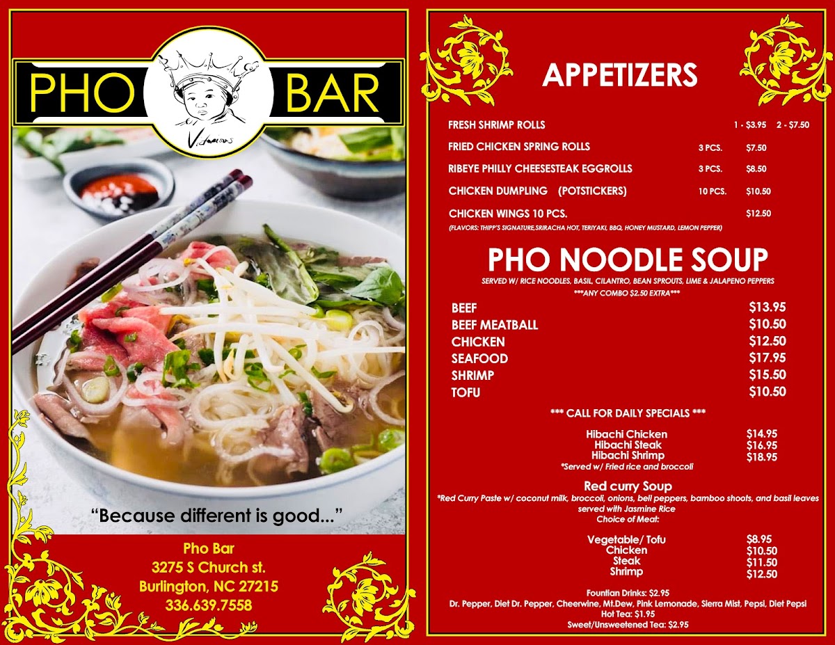 Pho Bar in Burlington offers a diverse and flavorful menu that caters to a variety of tastes. For appetizers, guests can choose from options like the Fresh Shrimp Roll ($1 per piece) and Fresh Tofu Roll ($1 per piece), as well as the Vegetable Dumplings (8 pieces) for a hearty start to the meal. If you're in the mood for something crispy, the Chicken Wings (6 pieces) are a great choice. The pho noodle soup menu is a highlight, with options such as Beef Pho, Meatball Pho, Combination Pho, Chicken Pho, and Seafood Pho, offering something for every pho lover. For those who prefer hibachi, Pho Bar serves up Hibachi Chicken, Hibachi Steak, Hibachi Shrimp, and Hibachi Vegetable for a satisfying, grilled experience. The Pad Thai options are plentiful, with choices like Beef Pad Thai, Chicken Pad Thai, Seafood Pad Thai, Shrimp Pad Thai, and Tofu Pad Thai, each offering a rich, flavorful twist on the classic dish. If you're craving a comforting, spicy dish, the Red Curry Soup with options like Tofu Red Curry, Chicken Red Curry, Steak Red Curry, Shrimp Red Curry, and Seafood Red Curry provides a warm, bold option. To quench your thirst, the restaurant offers a selection of fountain drinks including Cheerwine, Mountain Dew, Pink Lemonade, Starry, and Pepsi. For those who like to customize their meals, there are various add-ons available, such as Hot Chili Oil, Fried Garlic, Extra Sriracha, Extra Hoison, and Extra Beef Broth. The menu at Pho Bar promises a satisfying dining experience with something for everyone.