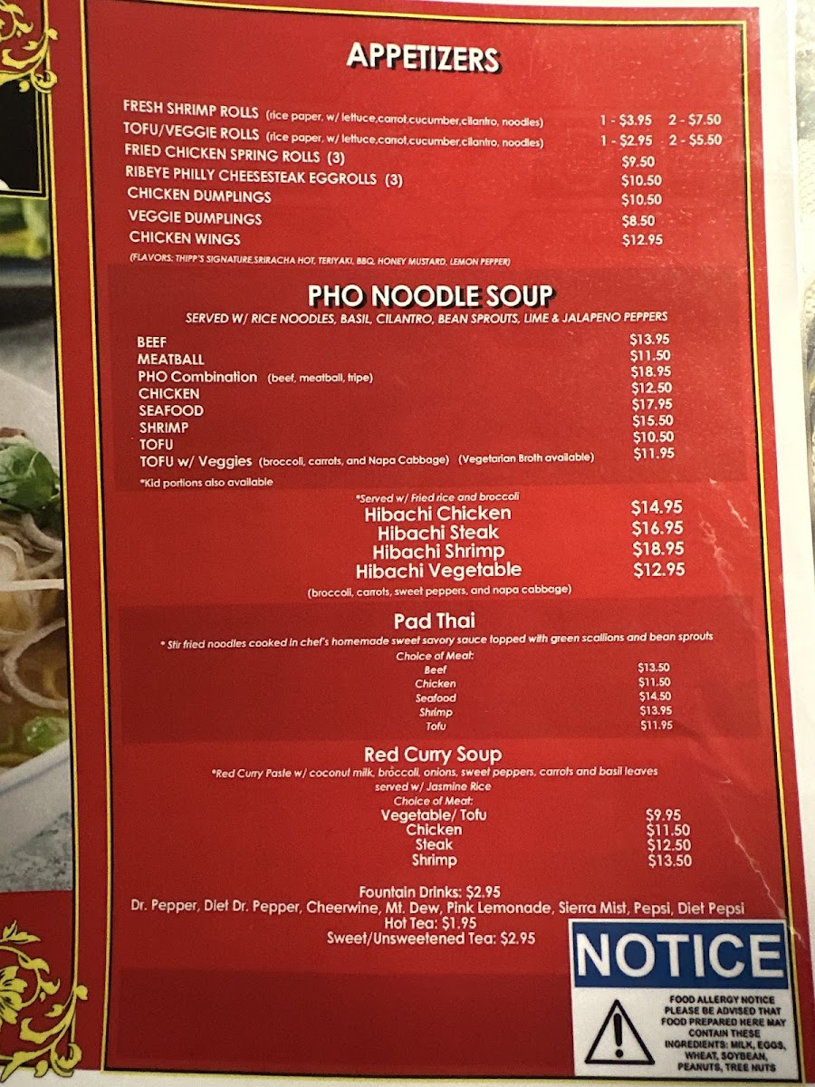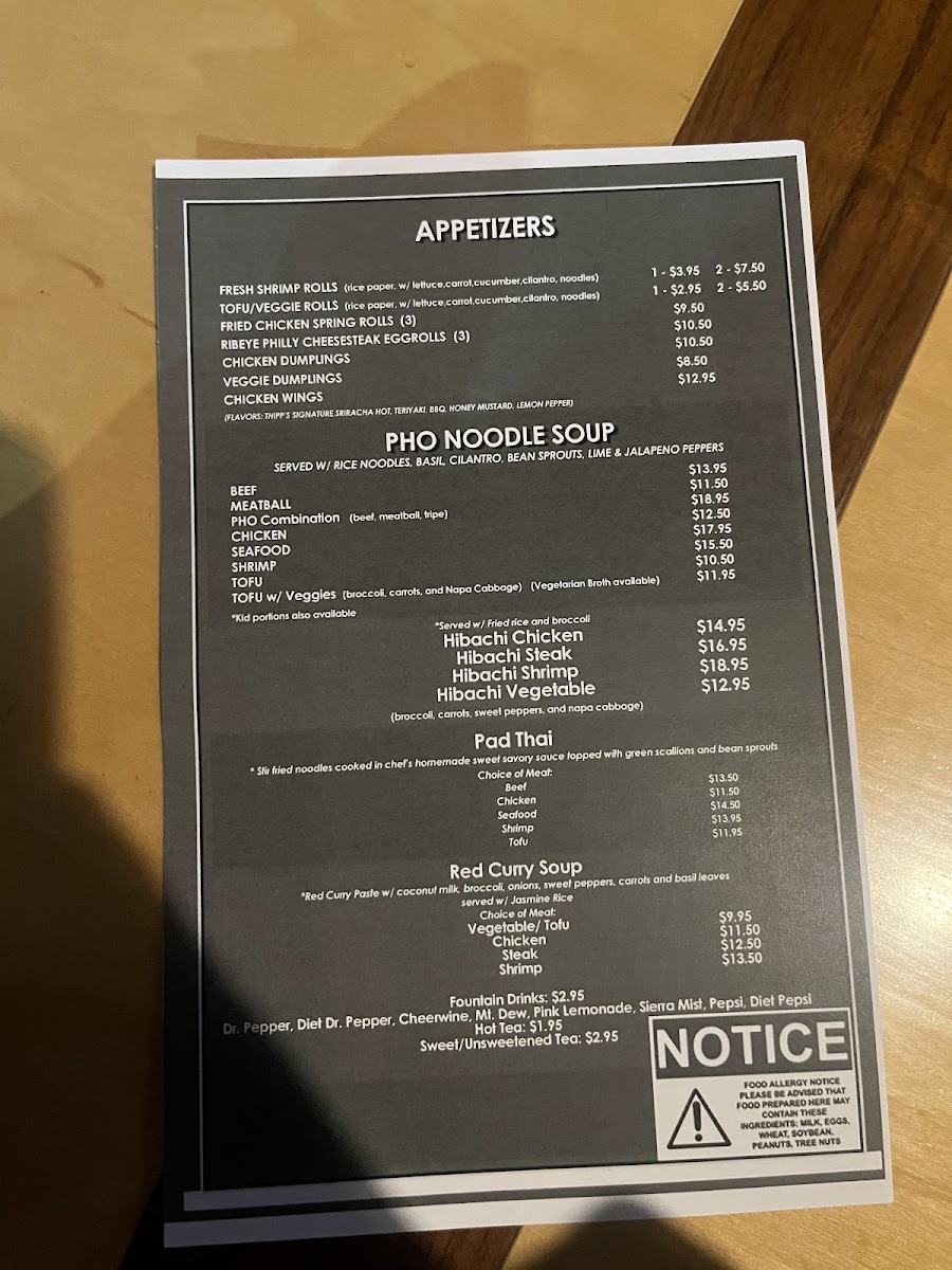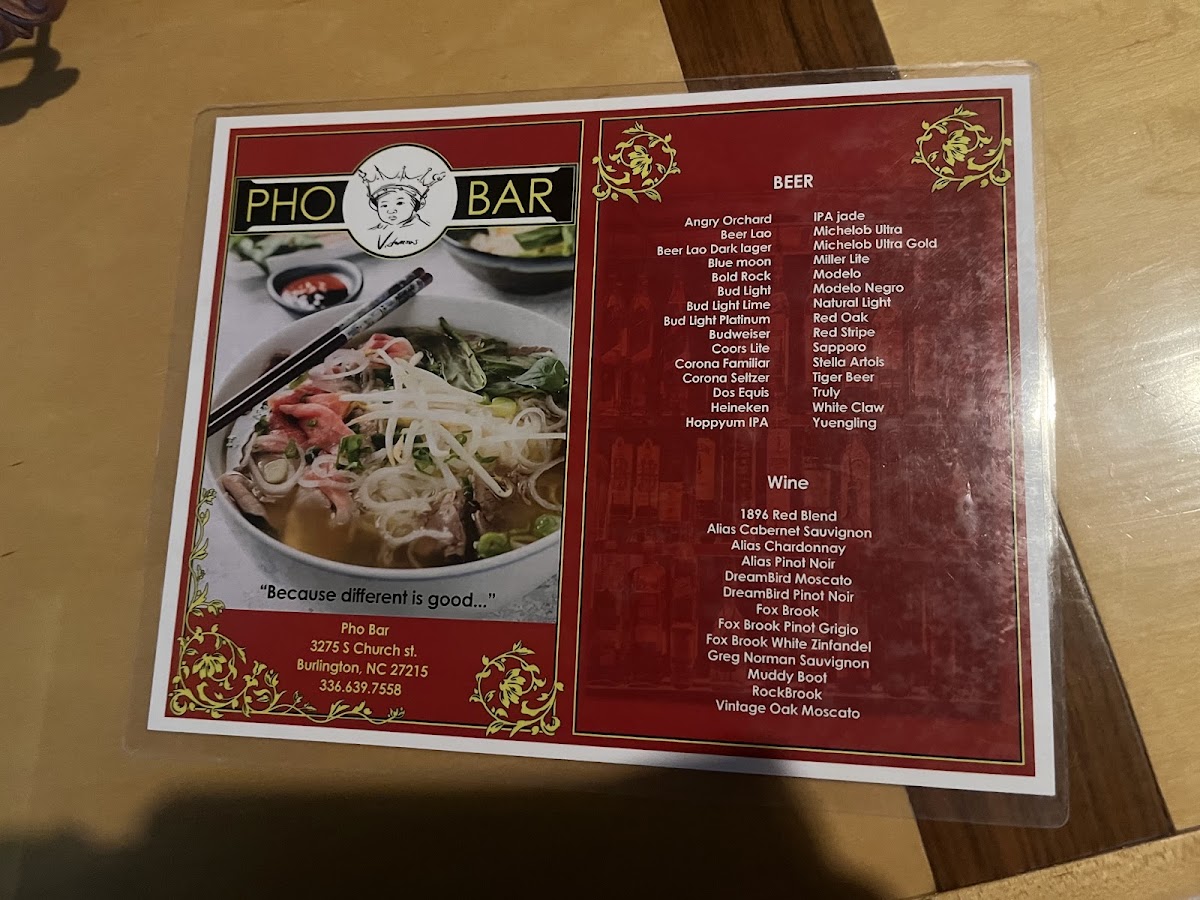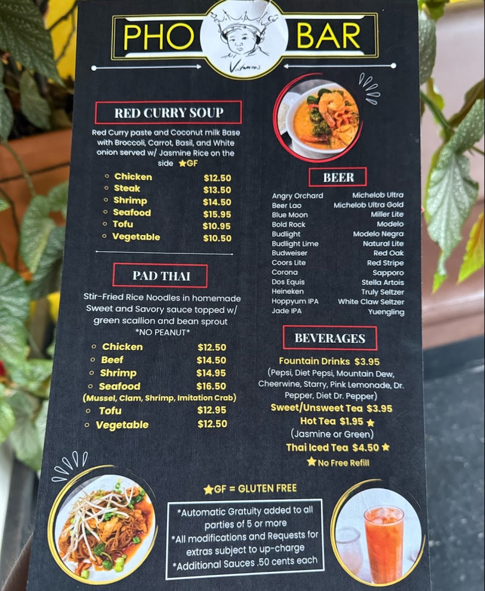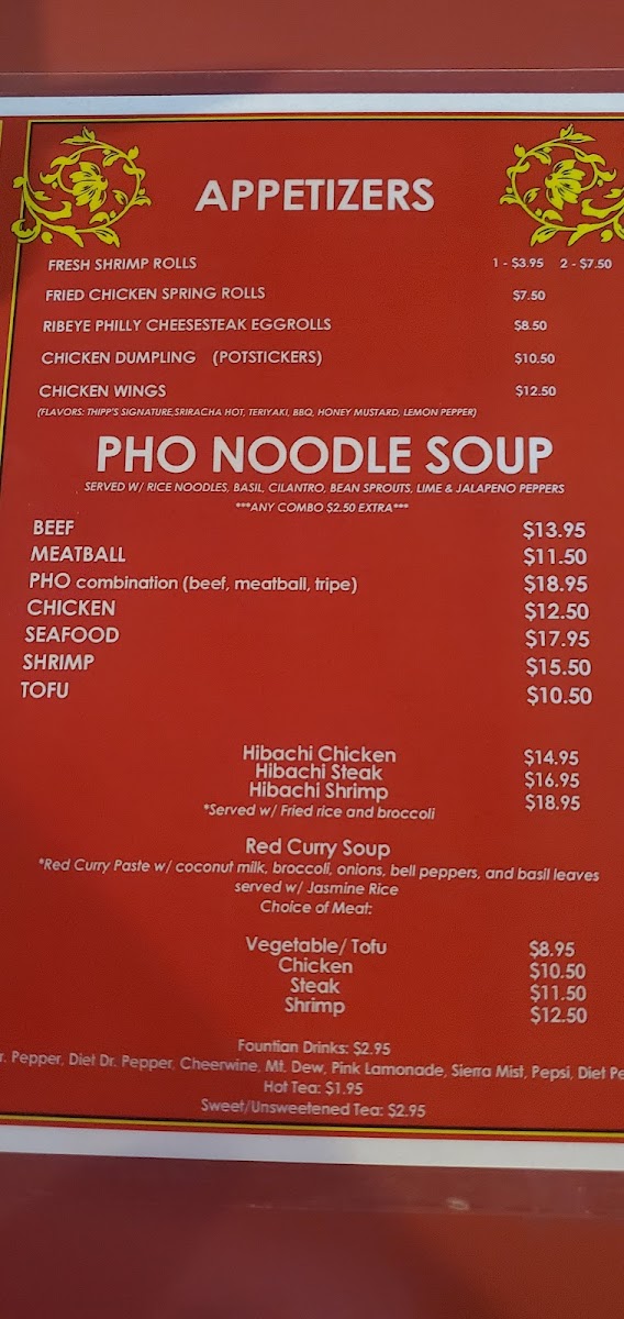 Pho Bar in Burlington offers a diverse and flavorful menu that caters to a variety of tastes. For appetizers, guests can choose from options like the Fresh Shrimp Roll ($1 per piece) and Fresh Tofu Roll ($1 per piece), as well as the Vegetable Dumplings (8 pieces) for a hearty start to the meal. If you're in the mood for something crispy, the Chicken Wings (6 pieces) are a great choice. The pho noodle soup menu is a highlight, with options such as Beef Pho, Meatball Pho, Combination Pho, Chicken Pho, and Seafood Pho, offering something for every pho lover. For those who prefer hibachi, Pho Bar serves up Hibachi Chicken, Hibachi Steak, Hibachi Shrimp, and Hibachi Vegetable for a satisfying, grilled experience. The Pad Thai options are plentiful, with choices like Beef Pad Thai, Chicken Pad Thai, Seafood Pad Thai, Shrimp Pad Thai, and Tofu Pad Thai, each offering a rich, flavorful twist on the classic dish. If you're craving a comforting, spicy dish, the Red Curry Soup with options like Tofu Red Curry, Chicken Red Curry, Steak Red Curry, Shrimp Red Curry, and Seafood Red Curry provides a warm, bold option. To quench your thirst, the restaurant offers a selection of fountain drinks including Cheerwine, Mountain Dew, Pink Lemonade, Starry, and Pepsi. For those who like to customize their meals, there are various add-ons available, such as Hot Chili Oil, Fried Garlic, Extra Sriracha, Extra Hoison, and Extra Beef Broth. The menu at Pho Bar promises a satisfying dining experience with something for everyone.